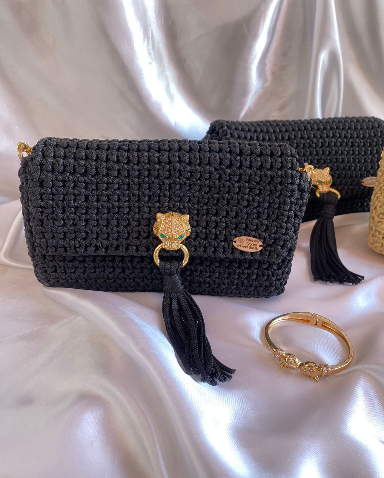 Bolsa JB Joias em fio naútico na cor preta, com alça de correntaria dourada, detalhe com cabeça de tigre como chaveiro