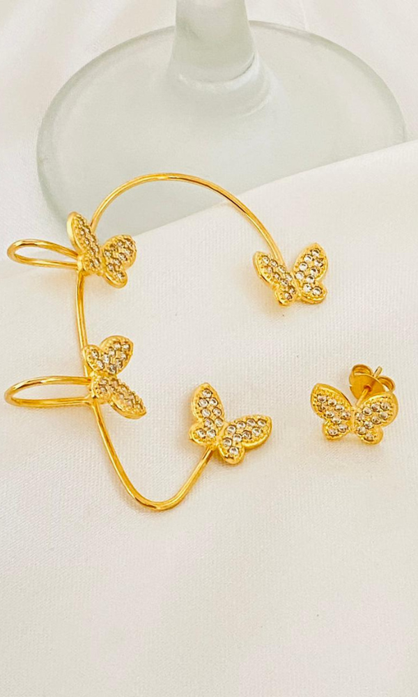 Brinco em uma orelha é Earcuff com quatro borboletas na outra um brinco pequeno de borboleta.